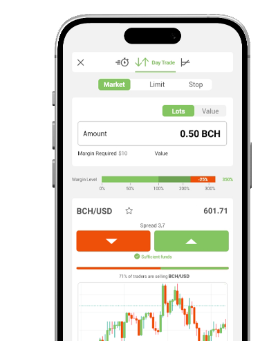 Opera criptomonedas de dos formas con easyMarkets. Elige operar al precio actual del mercado con Day Trade o establece una tasa para abrir la operación con Orden Pendiente, y cuando se alcance la tasa, tu orden será ejecutada.